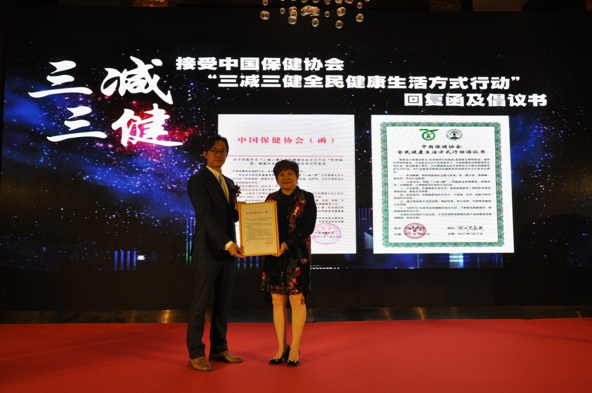 中國保健協(xié)會副理事長、全國保健服務(wù)標(biāo)準(zhǔn)化技術(shù)委員會專家副主任委員李萍向深圳美嘉康貿(mào)易有限公司頒發(fā)了“中國保健協(xié)會全民健康生活方式行動倡議書”與活動的批復(fù)。
